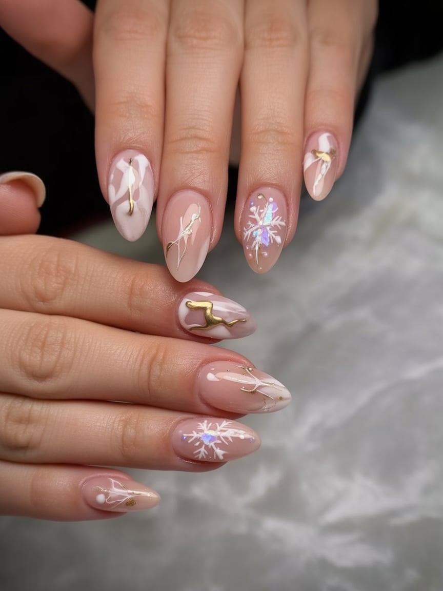 Delicate, dreamy, and a little bit whimsical—this manicure channels the first snowfall of the season. Soft neutral bases combined with white and gold accents offer understated-and-very-Festive kind of charm. The snowflakes shine softly beneath the light while still keeping that intensity clipped, giving to you something classy with the tiniest whisper of ‘holiday magic.'”