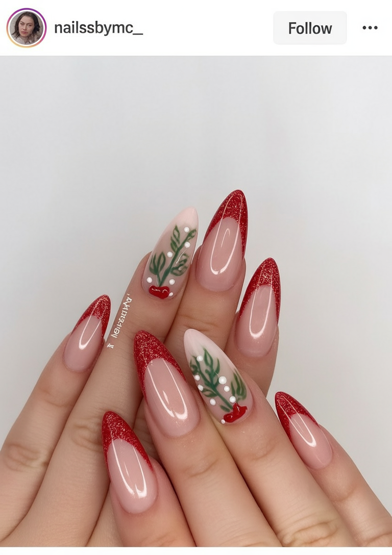 Sentimental yet fun, these nails feature red glitter French tips paired with delicate mistletoe accents. The green sprigs and white berries provide just the right hint of Christmas without being too overpowering on the design. It feels like a little holiday romance on your fingertips — soft, feminine, and totally charming.