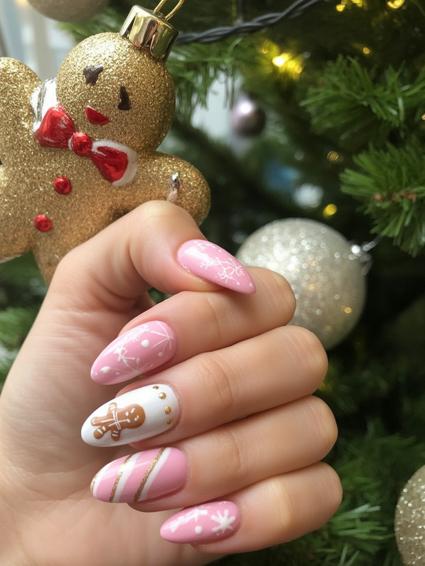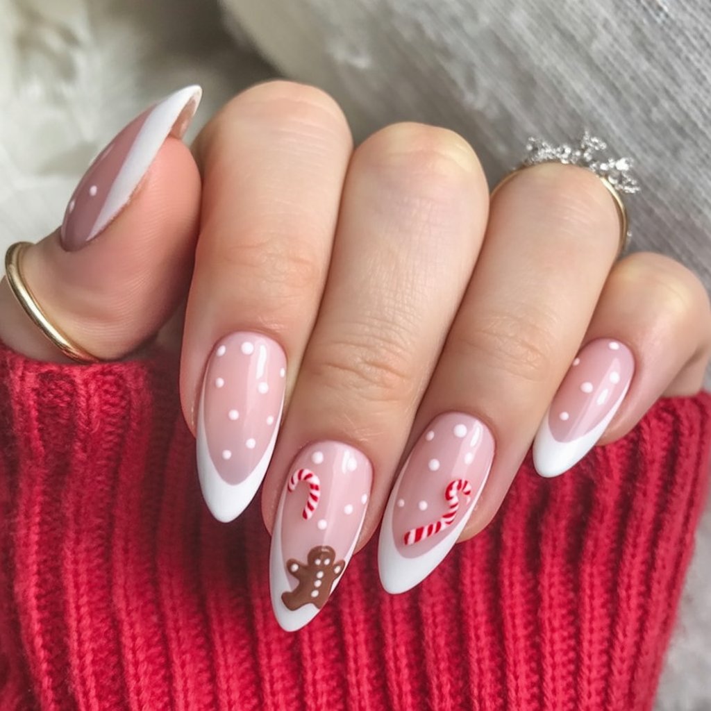 This design is like a little winter wonderland sitting on your fingertip. Soft pink bases with white french get a playful upgrade with candy canes, snowflakes, and a little gingerbread man ornament. Subtle but bursting with festive spirit — the same as baking cookies while snow falls outside.