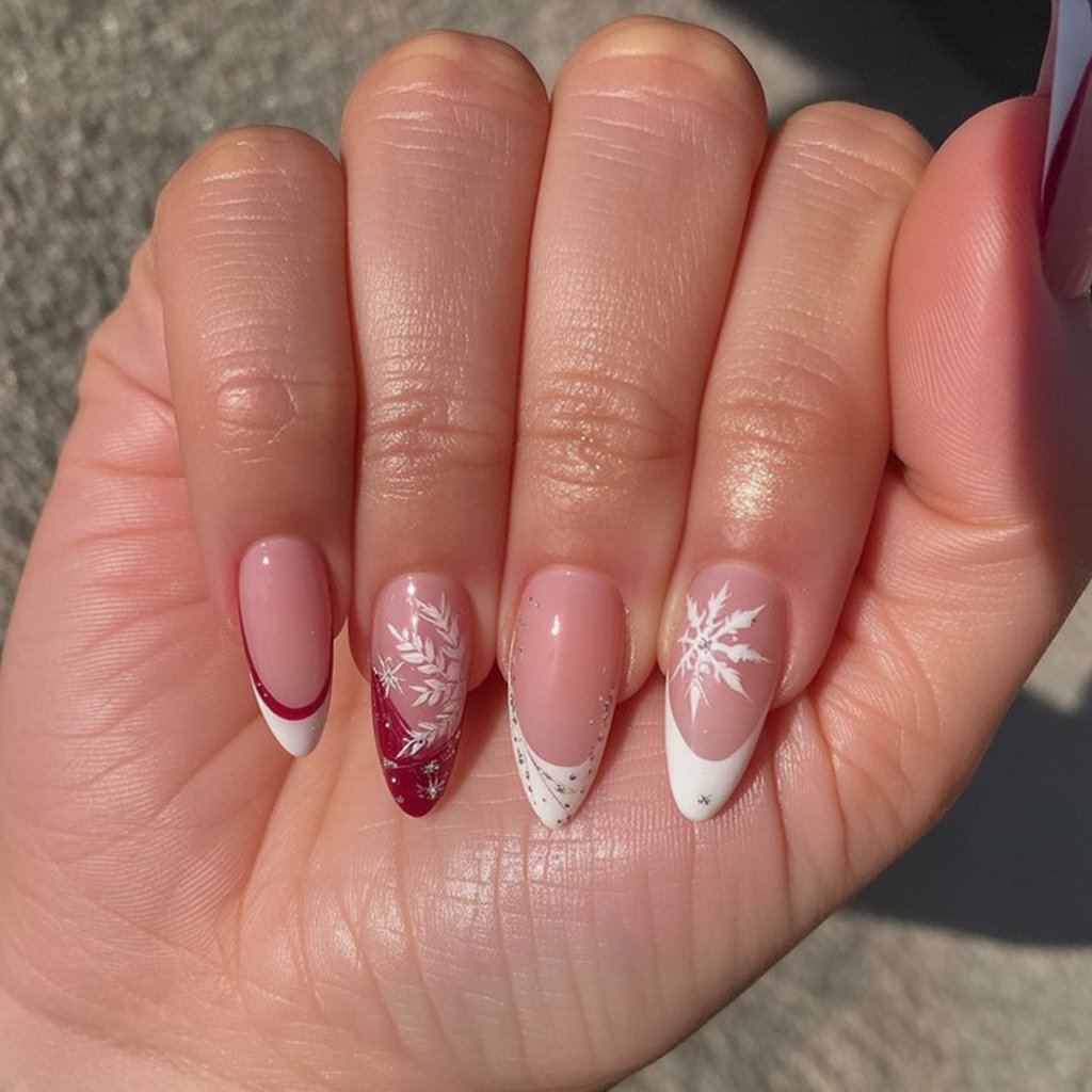 This manicure is perfect for almond nails as the shape elongates French tips with clean, delicate snowflake detailing. It is subtle enough for daily wear yet special enough for holiday parties. For those who love minimalist designs with a seasonal touch, this one nails it.