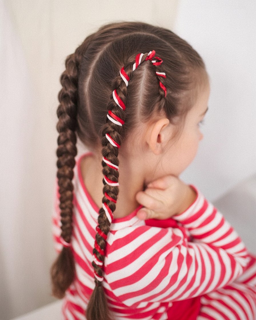 This hairstyle uses red and white ribbons swirled through long braids, creating a candy-cane effect. It is very playful and very bright, making it an excellent choice for kids.