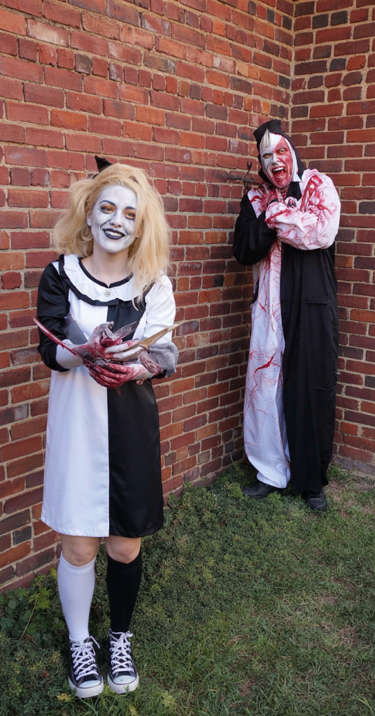 Go full horror this Halloween with this chilling duo. The woman is dressed as a twisted doll with half black, half white makeup and matching dress, finished with bloody gloves and creepy wide eyes. Her partner brings the scare factor as a grotesque nun dripping in fake blood. This scary Halloween costume idea for couples 2025 is perfect for horror fans who want to lean into creepy aesthetics and create a dramatic, unforgettable look.