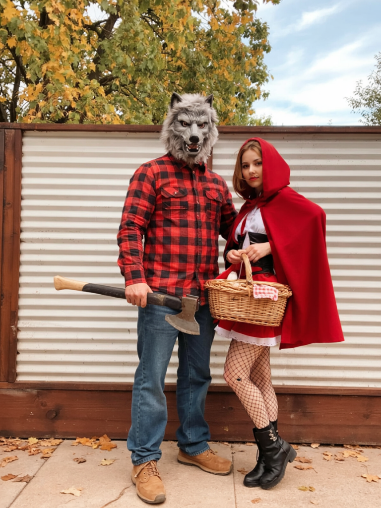 Bring a fairy tale to life with this clever couple’s costume. The woman transforms into Little Red Riding Hood with a flirty red cape, basket, and fishnet stockings. The man dons a lumberjack look, topped with a snarling wolf mask and an axe for full dramatic effect. This classic Halloween costume idea for couples 2025 blends storybook nostalgia with a spooky twist — perfect for outdoor events or themed parties.