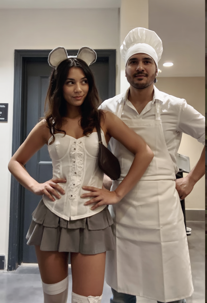 This fun and unexpected pairing turns the Pixar classic into a playful couples costume. The woman channels Remy the rat with fuzzy ears, a white corset top, and a flirty gray mini skirt. Her partner is Linguini, dressed in a chef’s hat and apron over a button-down shirt. It’s an easy Halloween costume 2025 idea that’s clever, minimal effort, and guaranteed to get laughs at any party. Bonus points if you carry a wooden spoon or a plush block of cheese!