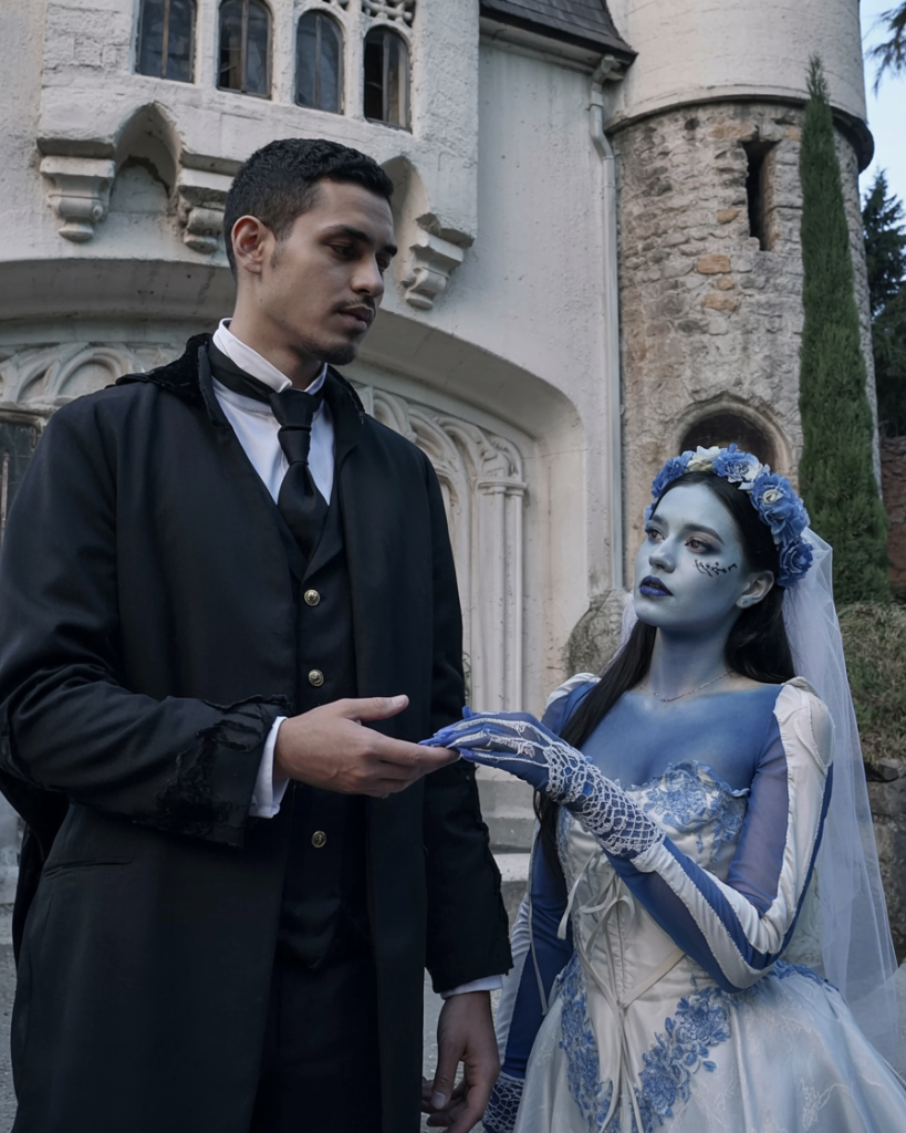 This hauntingly romantic Halloween costume recreates the eerie charm of Tim Burton’s Corpse Bride. The woman stuns in a detailed wedding gown with icy blue body paint, a skeleton-gloved hand, and a floral headpiece, bringing Emily to life with otherworldly beauty. Her partner plays Victor in a vintage black suit, complete with a cravat and solemn expression. This is a creative Halloween costume 2025 idea for couples who love gothic fairytales and want to stand out with stunning makeup and Victorian drama.