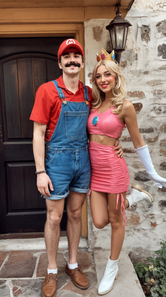 This timeless and cute costume duo never gets old. The man wears classic Mario overalls, a red shirt, and matching cap — and tops it off with a bushy mustache. His partner dazzles in a pink mini dress as Princess Peach, complete with a jeweled crown and white gloves. This funny and cute Halloween costume for couples 2025 is ideal for fans of Nintendo or anyone wanting a recognizable, cheerful throwback look.