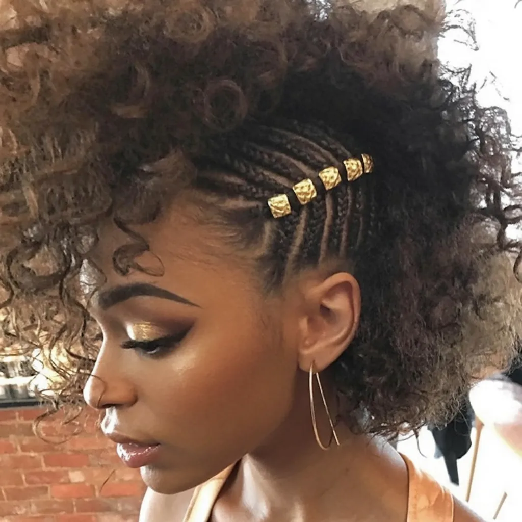 This is a gorgeous option for natural, curly texture, especially for black ppl who want a protective style that still feels soft and statement-making. The side braids keep the shape controlled while the top stays lifted and expressive, and that balance is what makes it work so well. Use a curl cream or mousse to define the puff, and keep the braided sections sleek with edge control if you like a polished finish. It also pairs beautifully with hoop earrings and warm makeup, so the whole look feels intentional. For women who want style, structure, and personality in one hairstyle, this one delivers beautifully.
