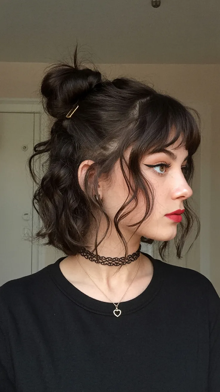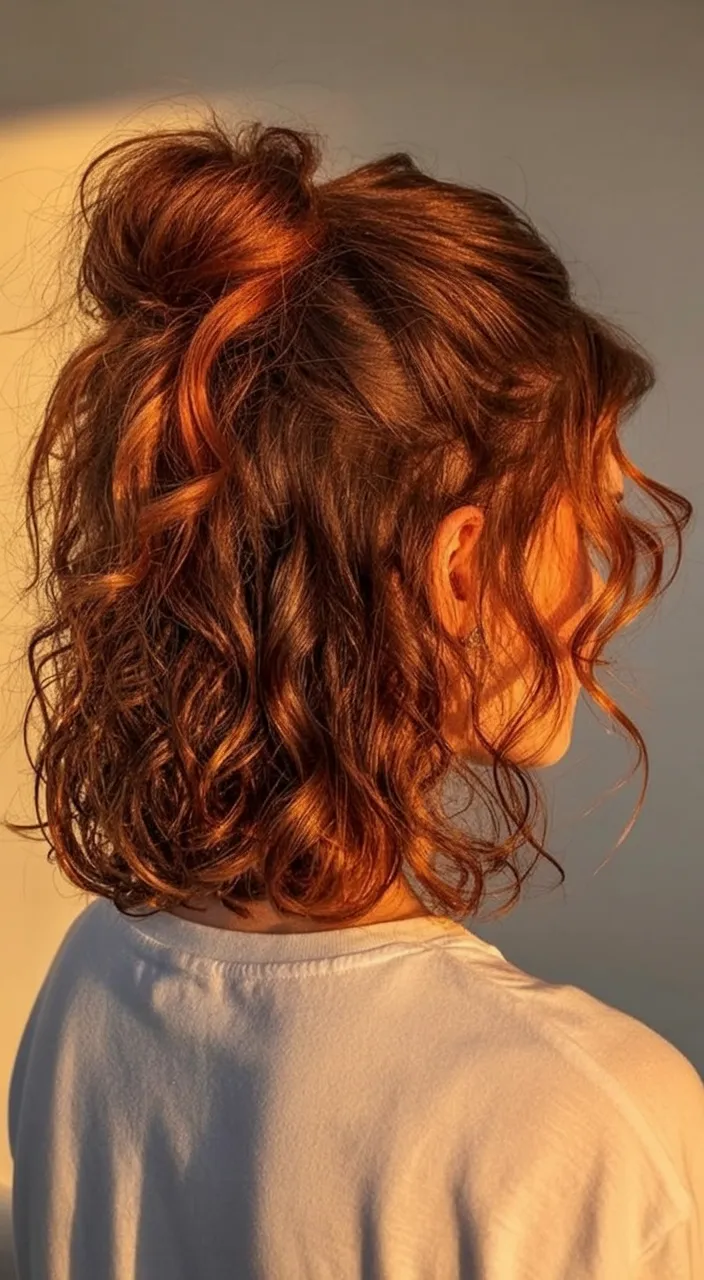 There is such a warm, easy glamour to this curly half-up style. The little top bun gives the shape a playful lift, while the curls underneath make everything feel soft, lively, and full of movement. It has that lovely just-dressed-up-enough quality that works whether you are home, out with friends, or heading somewhere that calls for a bit more effort. And because the curls do most of the visual work, the style never feels forced. It feels natural, flattering, and full of personality. On short hair especially, that combination of height and texture can make the whole cut feel more expressive and beautifully alive.