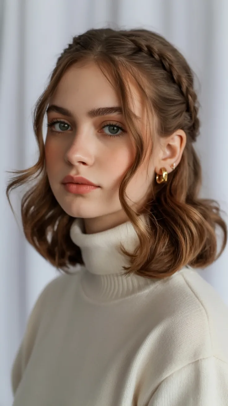 For styling, this works best on hair with a bit of bend or soft texture, whether that is natural or created with a curling wand. The braid detail is perfect for days when you want to elevate a short haircut without putting all of the hair up. It is especially flattering on bobs with face-framing pieces because those loose front strands keep the style modern and soft. If your hair is very straight, add a touch of wave first so the final result feels fuller. A flexible-hold spray will keep the braids neat while letting the rest of the hair move naturally.