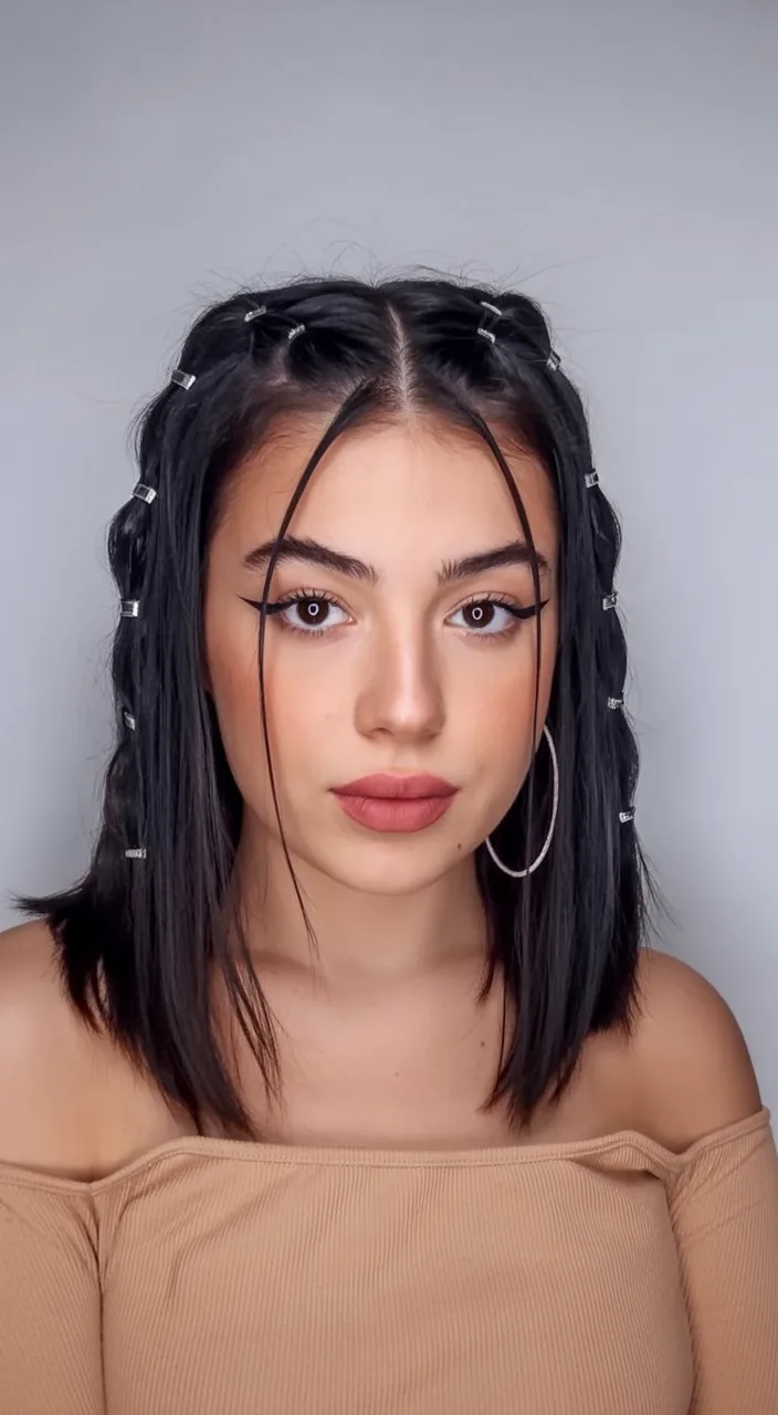 This look fits straight hair best because the smooth texture helps the sectioning stand out clearly. It is a strong choice for Teens, for teens, or anyone who likes a more trend-aware finish without spending forever styling. In 2026, short hair continues to lean into clean lines with playful accents, and this idea lands right in that sweet spot. Use a flat iron first if needed, then secure the mini sections with discreet elastics and wrap your accessories over them. It is Quick, modern, and surprisingly easy once you map out the parting. For a night out or a special event, it gives short hair a fashion-forward upgrade.