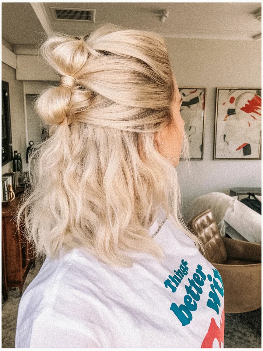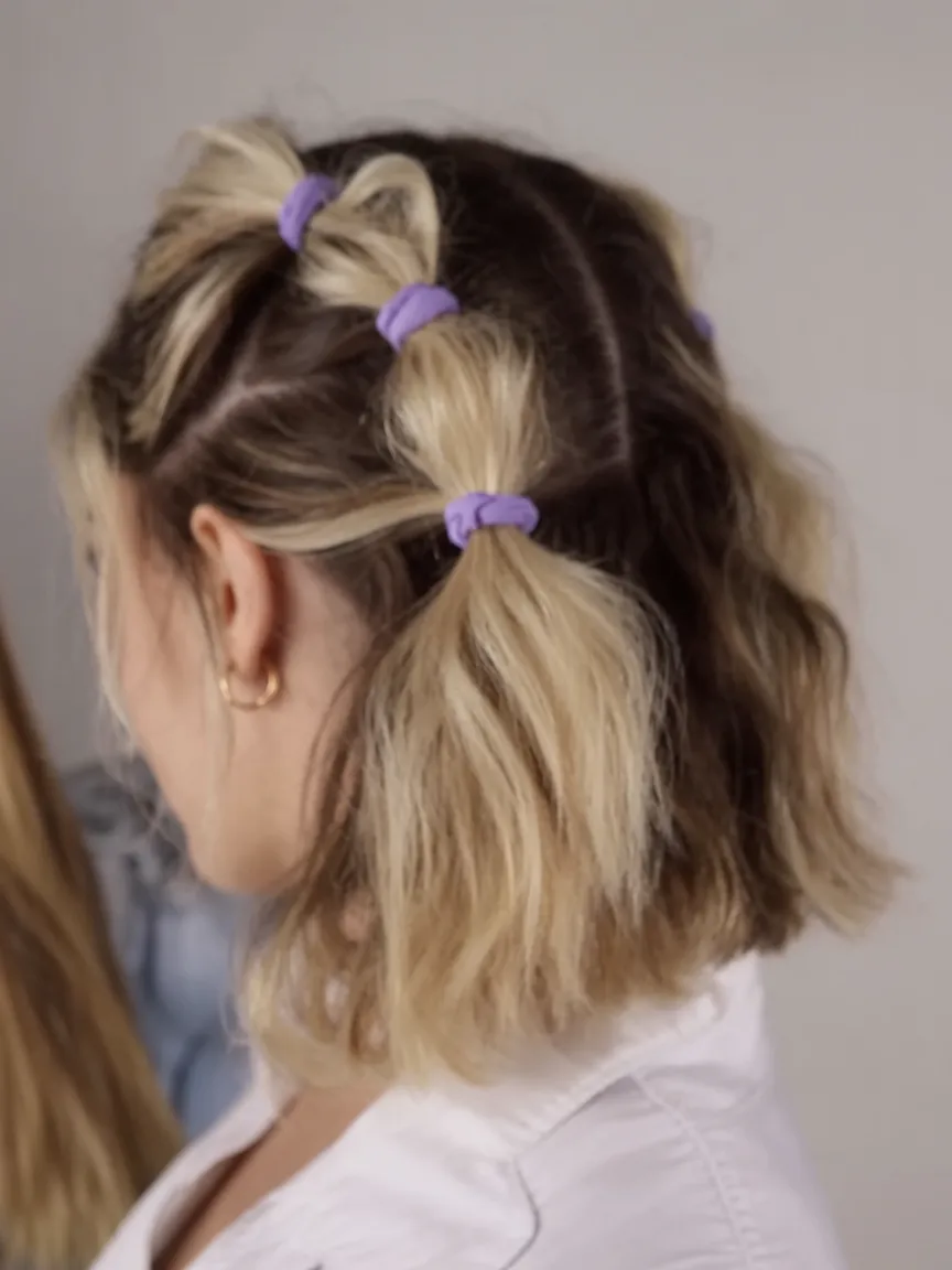 This look feels like a little mood boost in hairstyle form. The soft waves keep it pretty and touchable, while the stacked mini buns add a playful twist that makes the whole style feel more original. It is sweet without looking childish, which is a tricky balance and exactly why this one stands out. There is a carefree, weekend kind of charm to it, like the hairstyle version of your favorite oversized tee and a good playlist. For short blonde hair especially, the shape catches light beautifully and gives the style dimension from every angle. It is fun, yes, but still polished enough to feel put together.