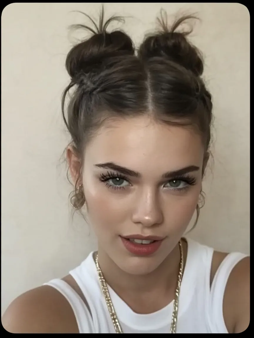 This hairstyle is pure playful confidence. The two mini buns perched high on the head give short hair that instantly fun, flirty energy that can make your whole face look brighter. What keeps it from feeling childish is the clean center part and those softly loose pieces around the face, which add just enough softness and polish. It has that cool off-duty charm that works when you want something different from the usual ponytail or clip-back look. On short hair, styles like this feel especially fresh because they show personality right away. It is cute, a little cheeky, and perfect for days when you want your hairstyle to feel like part of the outfit.
