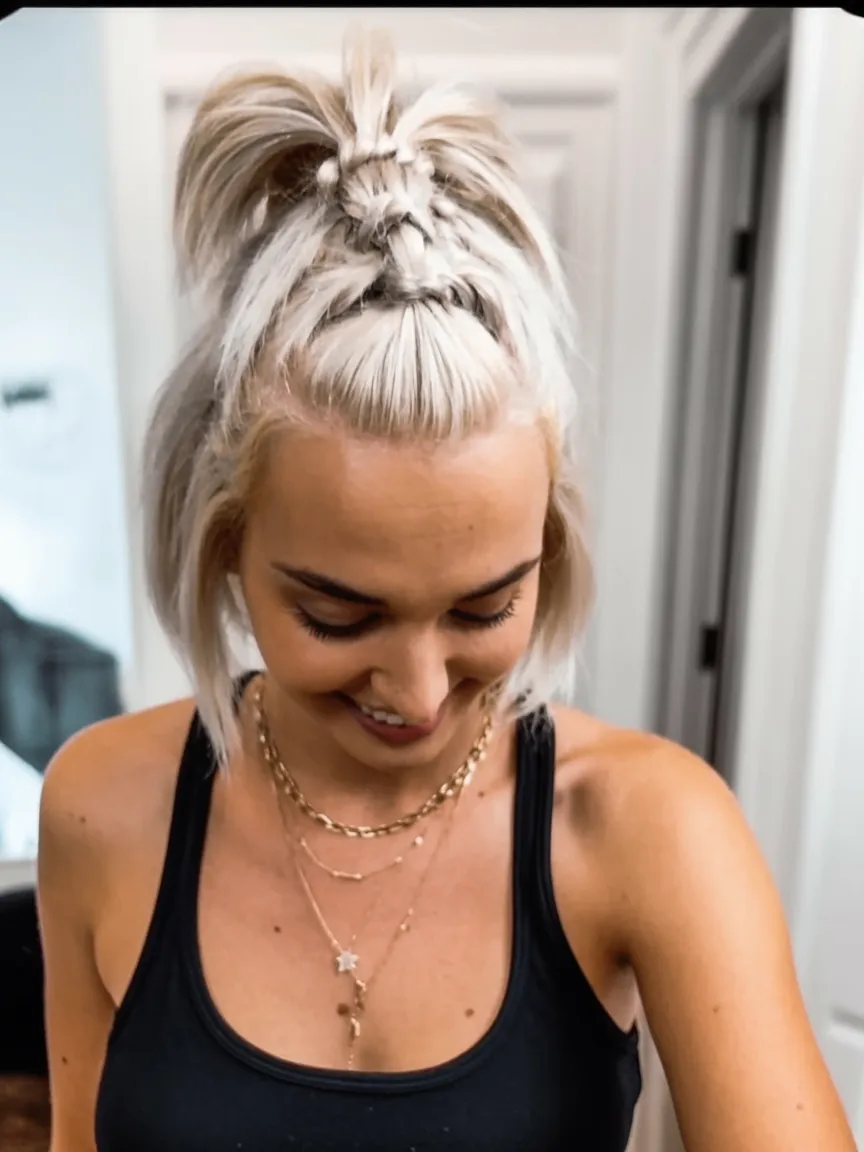 This style is all fun. The little braided sections feeding into a high ponytail give this short platinum bob such a lively, upbeat personality. It feels sporty, playful, and a bit flirty, like the hairstyle equivalent of good energy on a busy day. What I like most is that it makes short hair feel dynamic. Instead of working around the limited length, it uses it to create something bouncy and full of character. The lifted top adds height, the loose ends keep it soft, and the whole thing has that cheerful confidence that makes a cute hairstyle feel genuinely memorable.