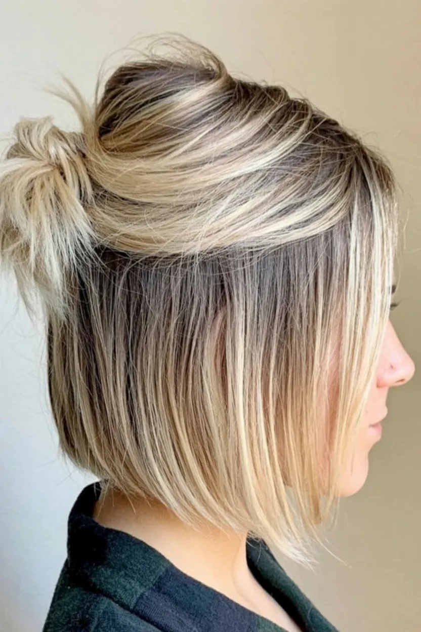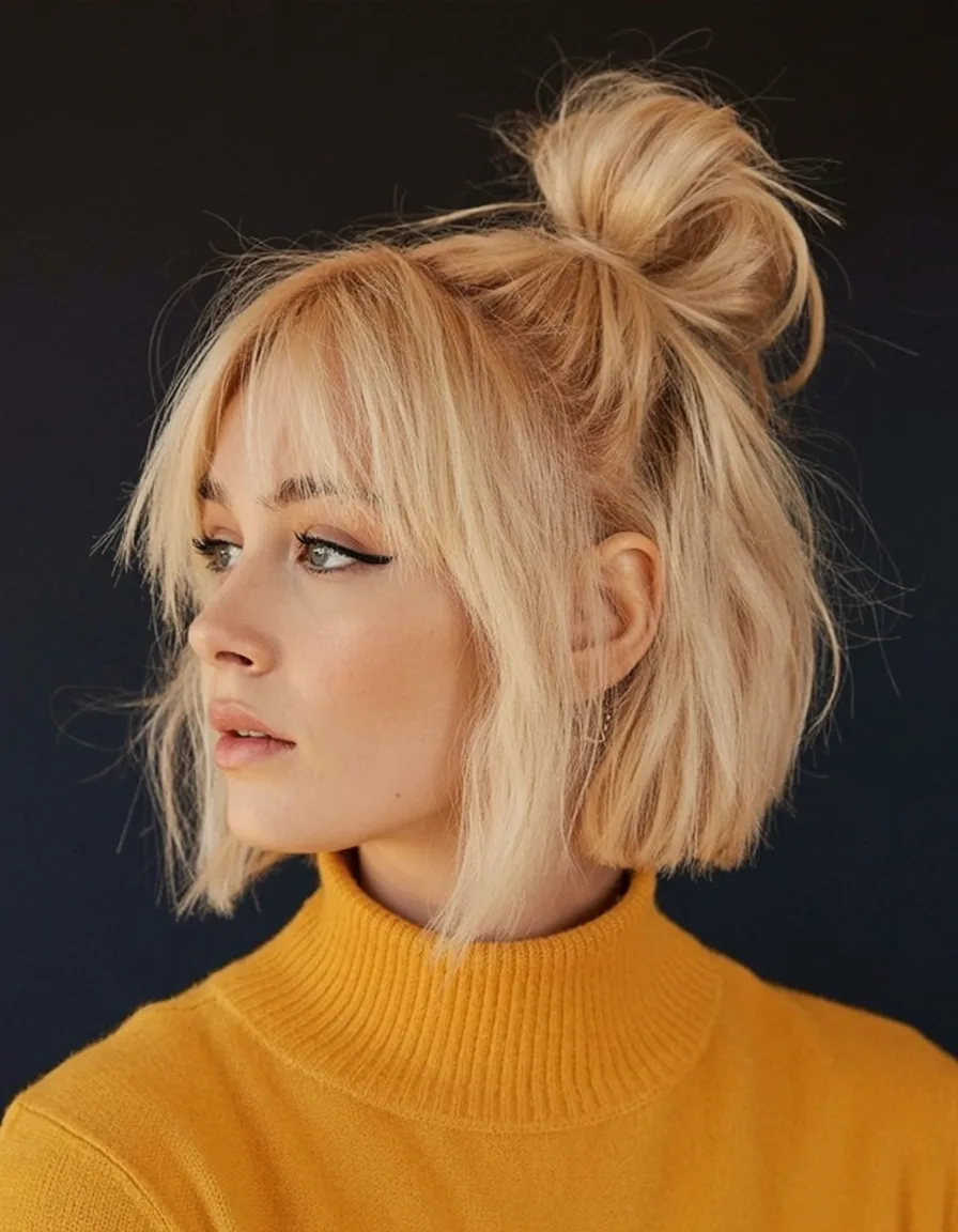 What makes this cut-and-style combo special is how easily it shifts mood. You can wear it relaxed for daytime or make it feel dressier by defining the front pieces with a curling wand. It works beautifully on straight hair that holds shape, but it can also flatter soft, wavy textures. For women who want an easy updo without forcing all of the hair back, this is a lovely in-between option. It gives short hair more flexibility, especially if you get bored wearing your bob the same way every day. A texturizing spray helps keep the bun light and full instead of flat.