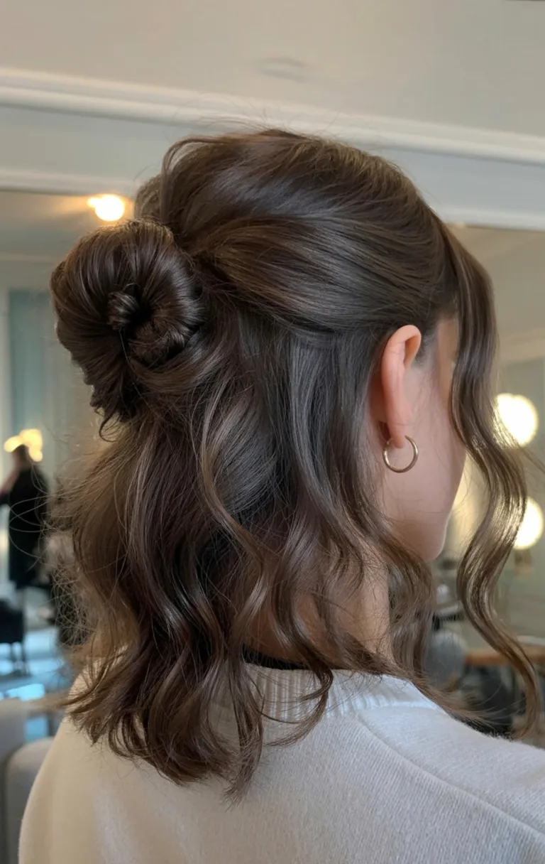 This half-up style feels soft, graceful, and just a little bit dressy in the prettiest way. The twisted bun at the back has that rose-like shape that makes it look more special than a standard knot, while the loose waves underneath keep it from feeling too formal. It is one of those hairstyles that makes short hair look intentionally romantic, almost like you planned the whole mood around it. The face-framing pieces are what really make it sing. They keep everything light and flattering, which is exactly what you want when you are styling a shorter cut for something a little nicer than everyday errands.