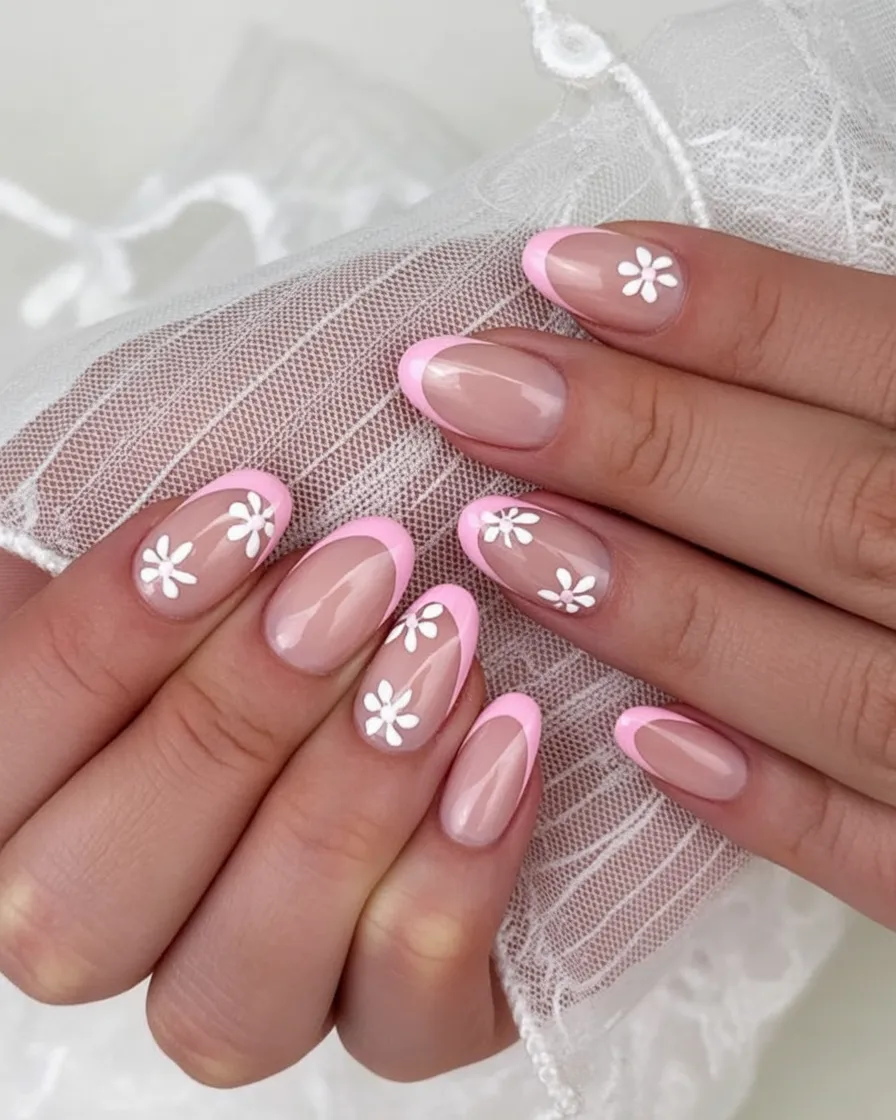 9. Soft Pink Daisy Almond Nails