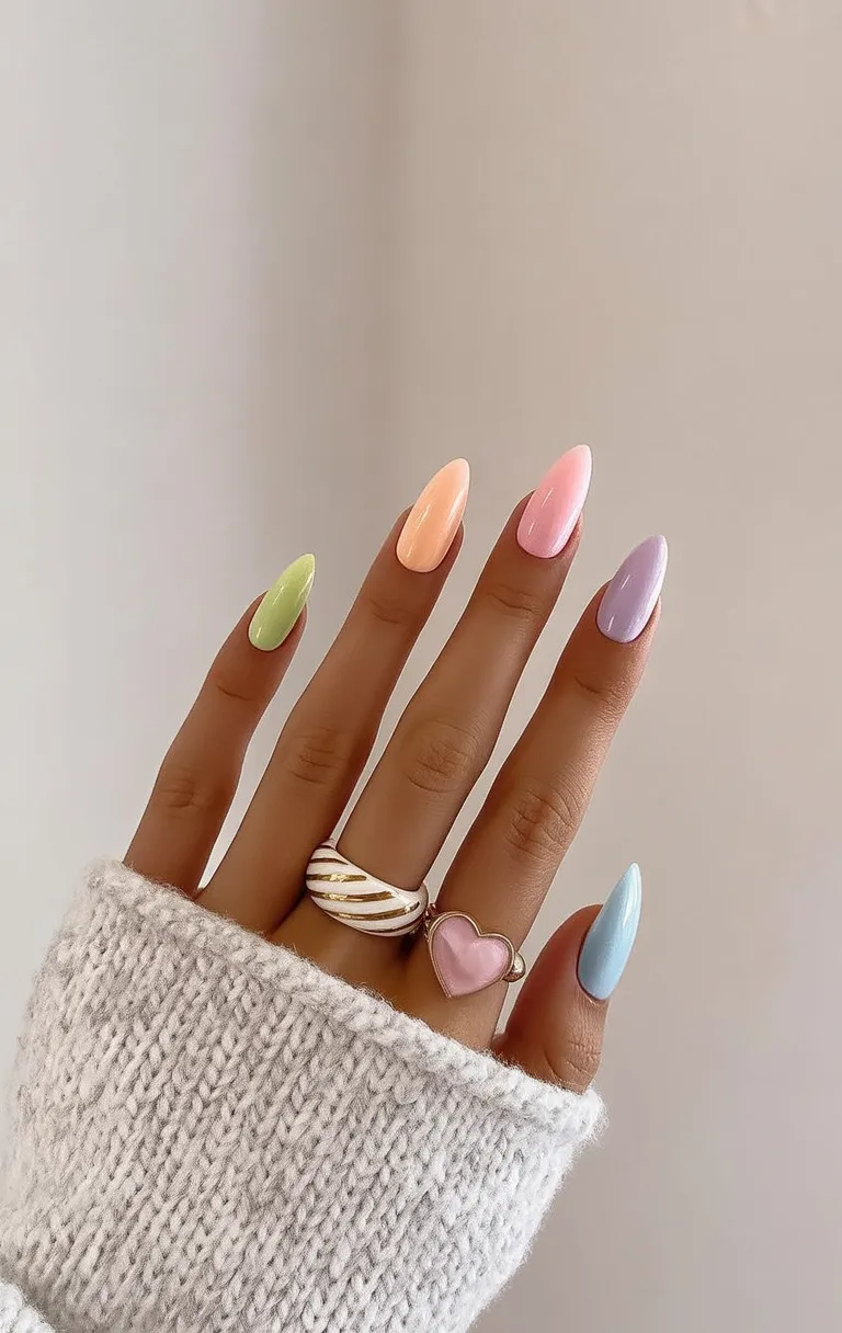 This manicure feels calm, polished, and quietly beautiful. The blend of soft pastel colors—gentle pink, peach, mint, and lavender—creates a soothing, balanced look that feels fresh without demanding attention. It’s the kind of nail style that whispers confidence rather than shouting, perfect for spring days when you want your hands to look effortlessly put together. There’s a simplicity here that feels very grown-up, almost like a reset button after bold winter designs.