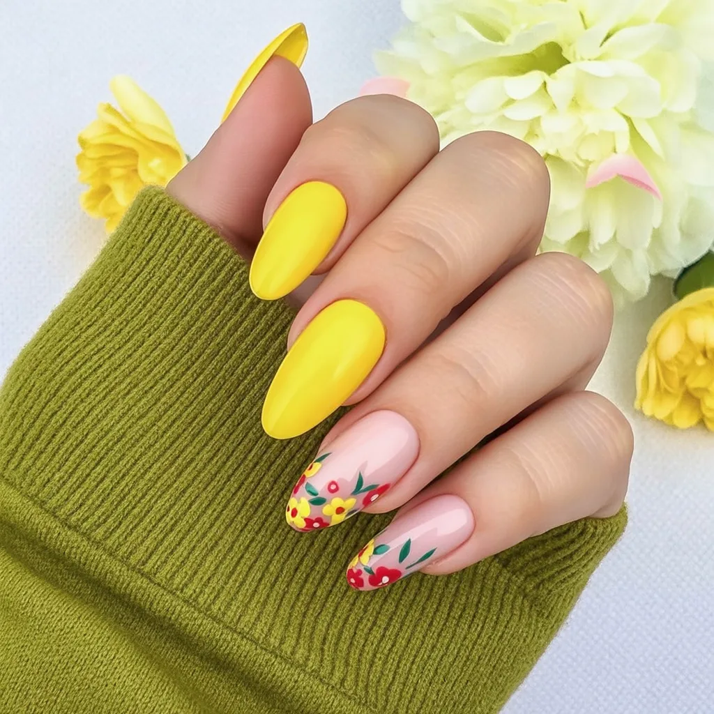6. Sunny Yellow Floral Almond Nails