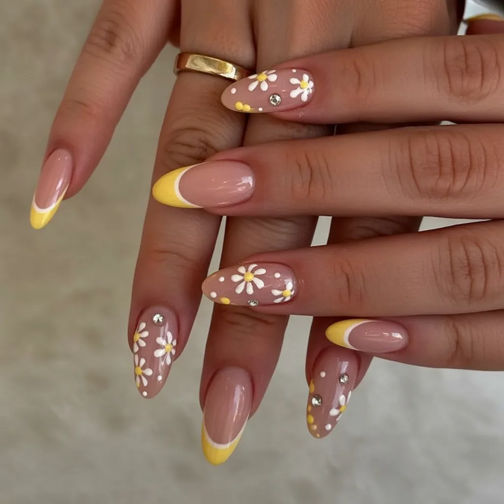 There’s a sunny, optimistic energy in this look. The soft yellow tips paired with daisy Designs feel cheerful and lighthearted, like spring in full bloom. It’s playful without being loud.
