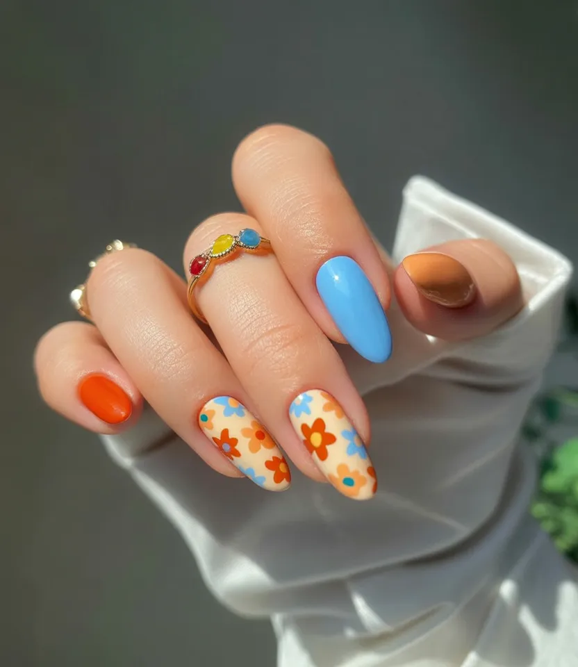 This manicure feels fun and nostalgic, with a playful retro vibe that instantly brightens your mood. The bold floral pattern mixed with solid colors creates a joyful, carefree look that feels perfect for spring days.