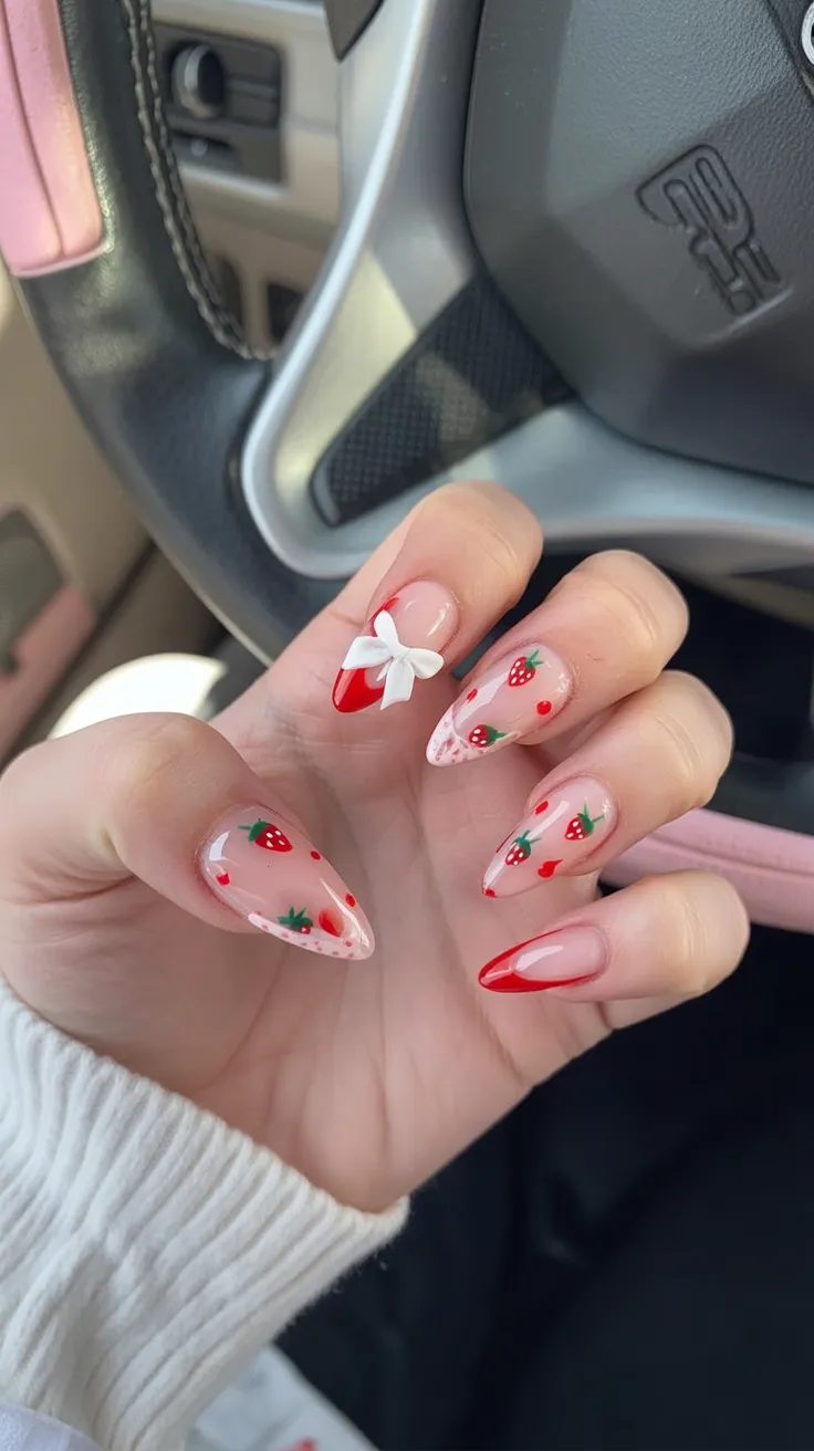 These nails are pure fun. The strawberry art paired with red French tips feels playful, sweet, and full of personality—like a fresh farmers’ market vibe right at your fingertips.