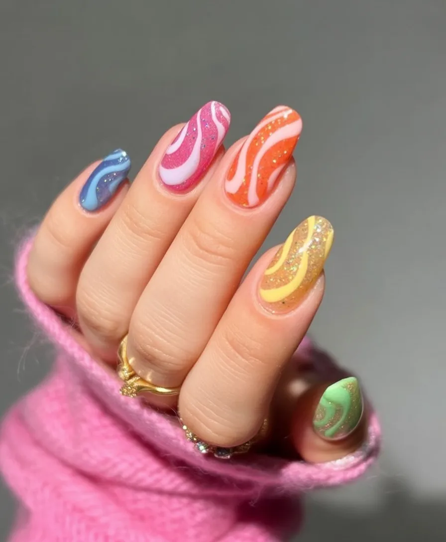 These nails feel playful and bold, like spring creativity unleashed. The swirling colors create movement and personality, giving off confident, artistic energy. It’s the kind of look that sparks conversation without trying too hard.