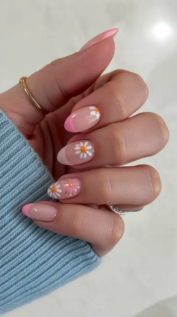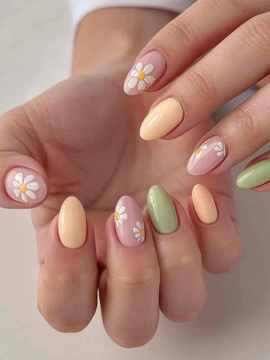 5. Pastel Daisy Almond Nails