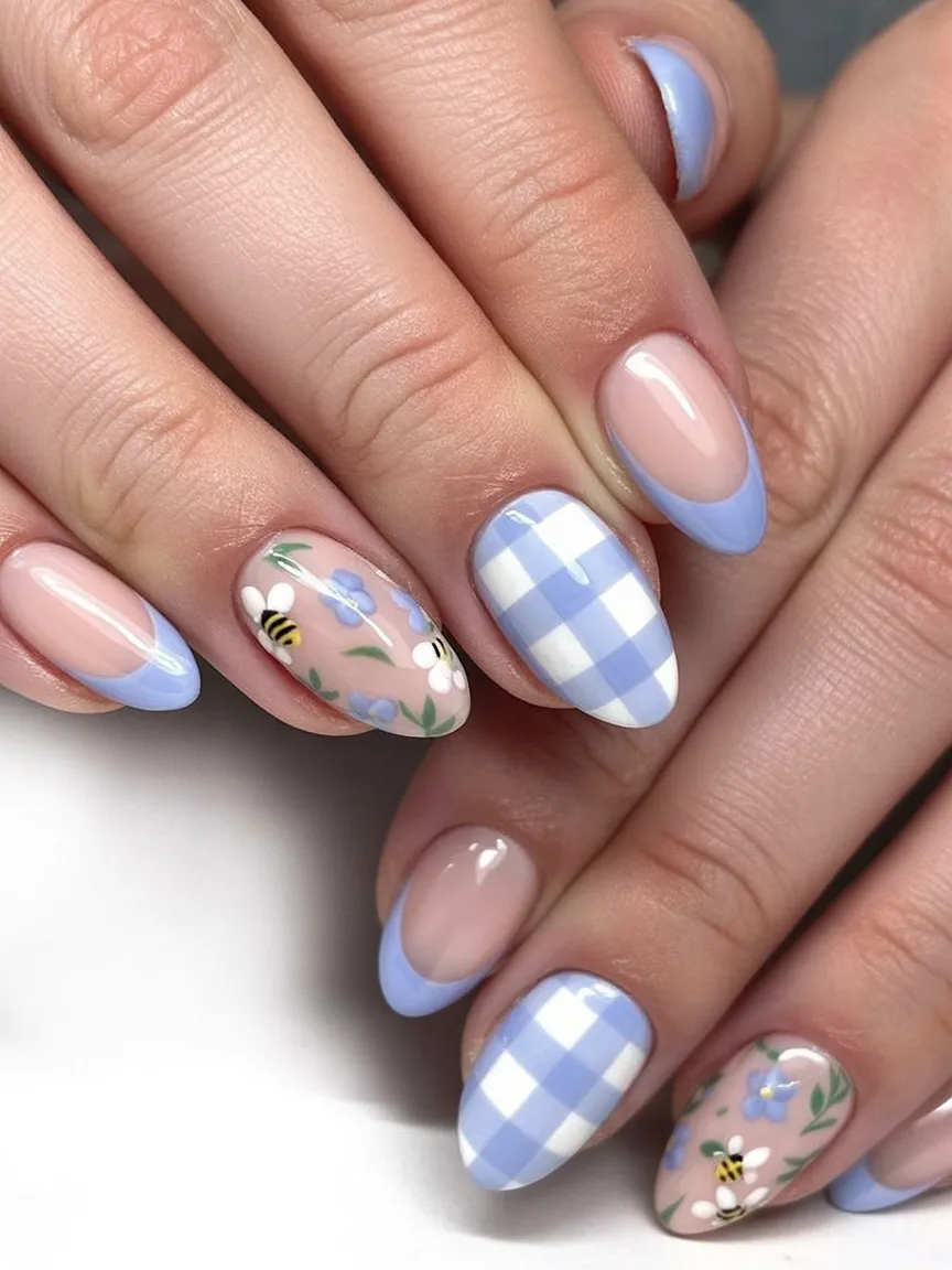 3. Soft Blue Gingham Almond Nails