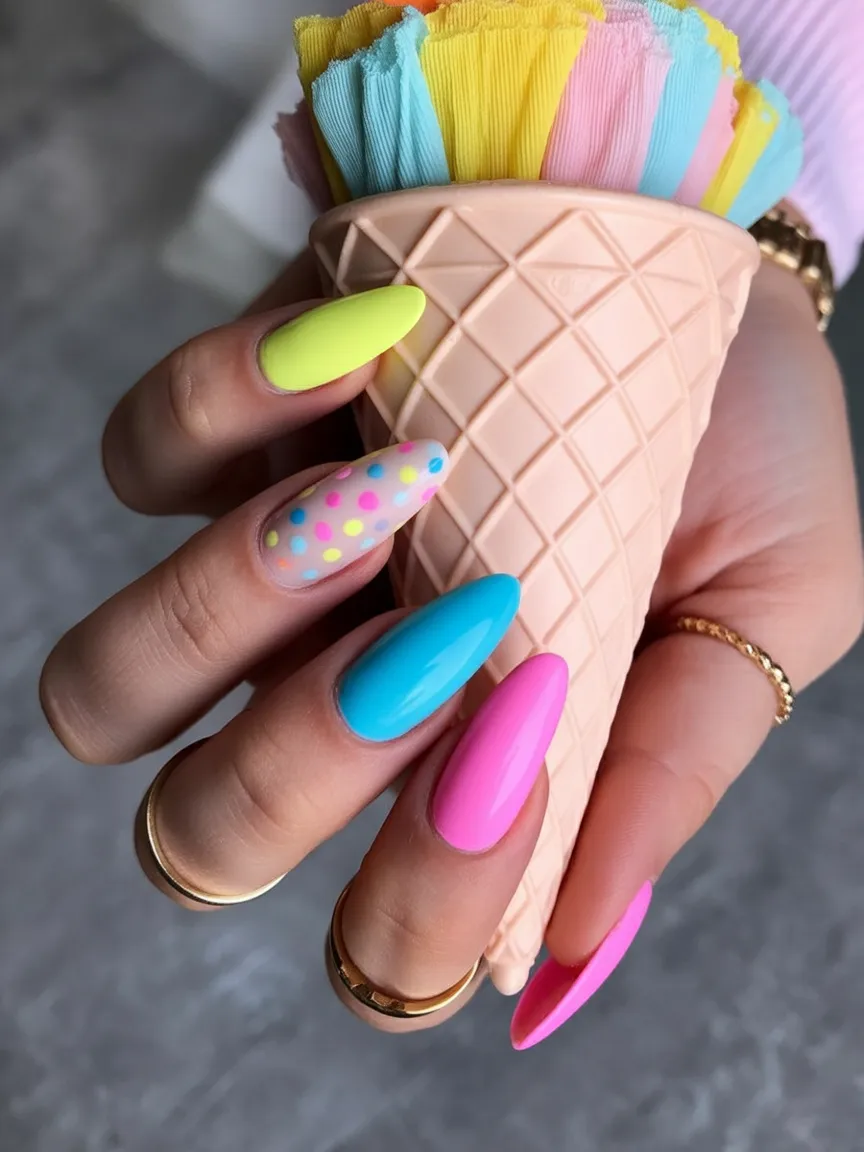 This manicure feels like pure spring joy—bright, carefree, and unapologetically fun. The mix of neon-inspired colors, soft dots, and smooth almond shapes creates a playful mood that instantly lifts your spirits. It has that fresh Inspo energy that feels young at heart but still stylish enough for grown-up confidence.