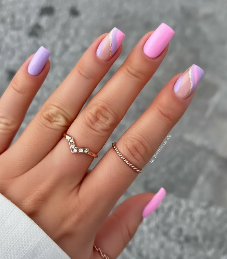 These nails strike a beautiful balance between soft and structured. The mix of pink and lilac with clean lines feels modern, confident, and subtly artistic.