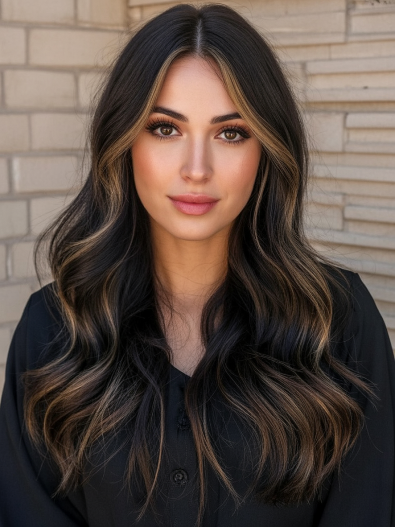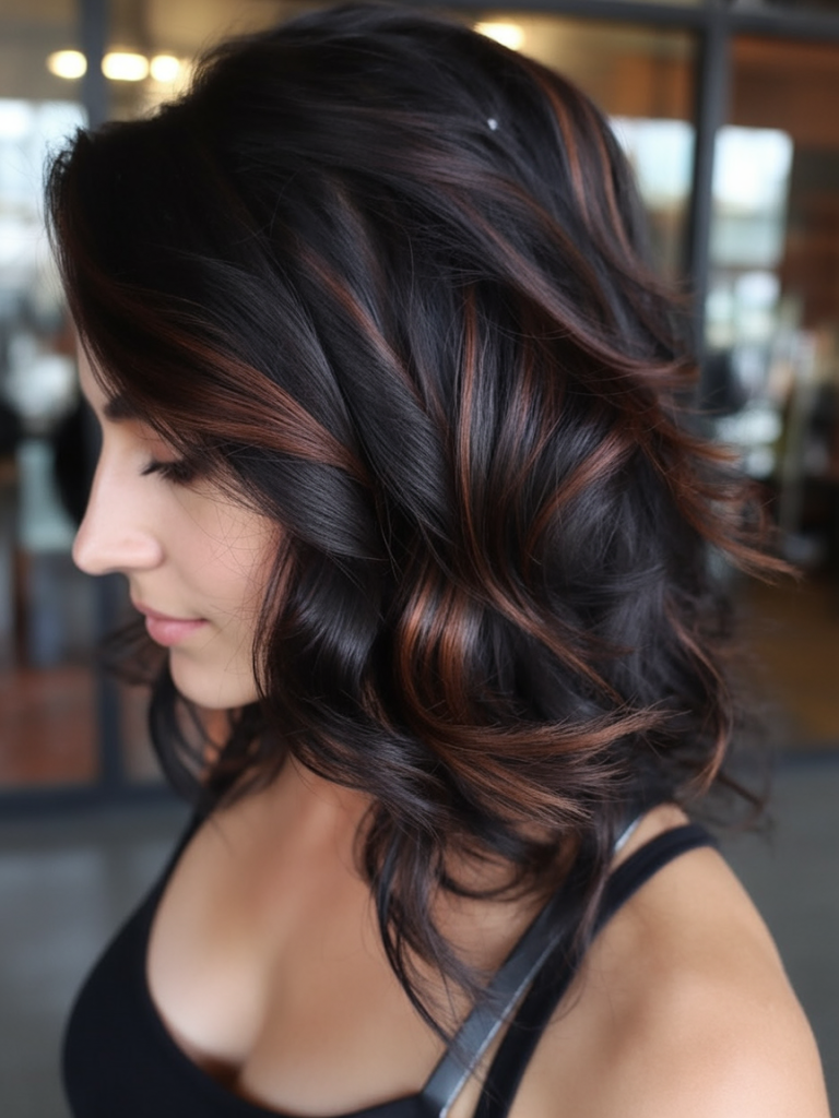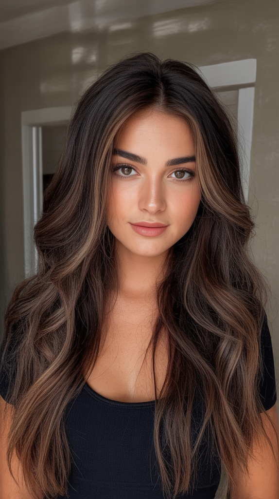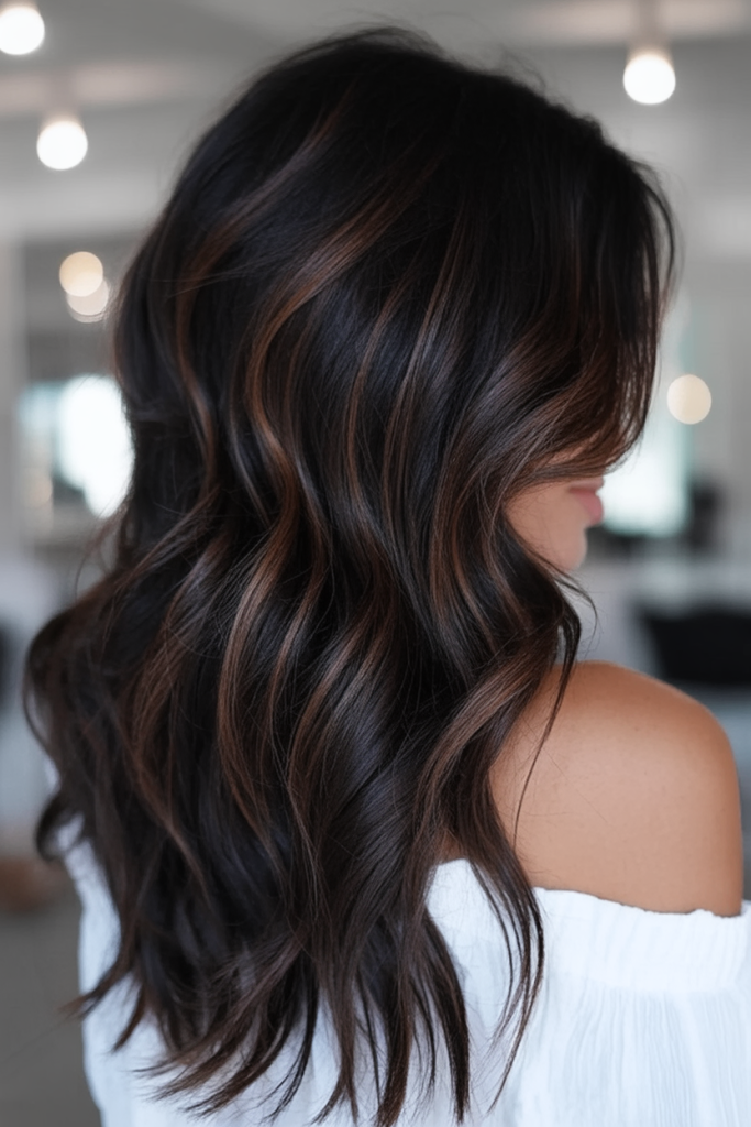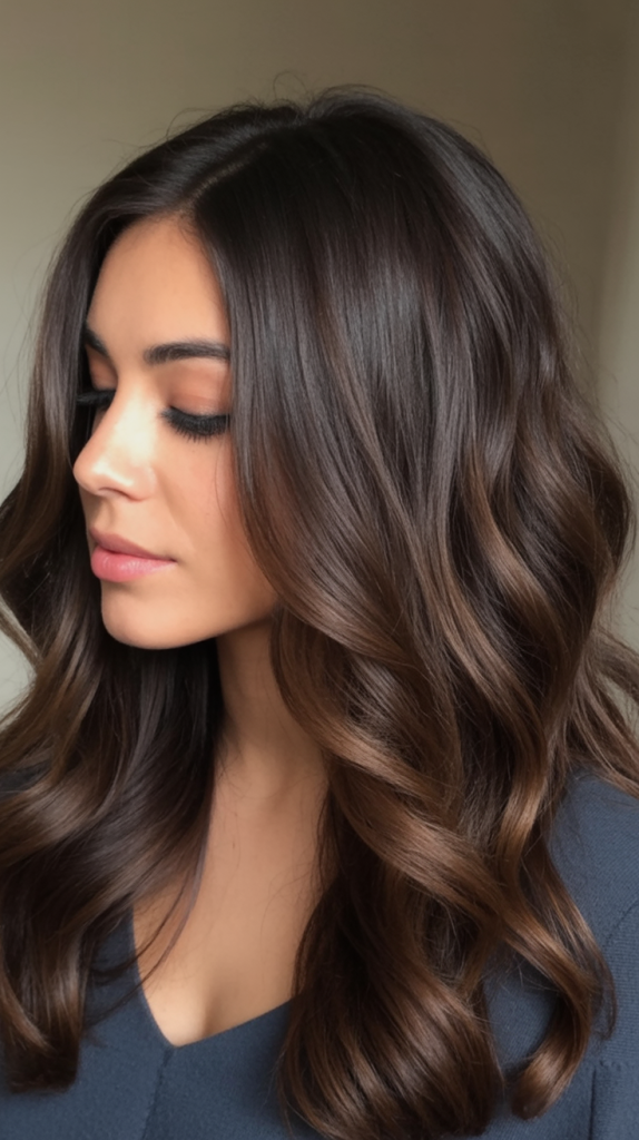 This stunning combination of a dark espresso base with gently diffused brown highlights adds dimension without overpowering the hair’s natural richness. Ideal for brunettes seeking a subtle lift, this style adds body and movement to medium length or long layers. It’s the universally flattering look that works for summer glamour or for winter warmth.