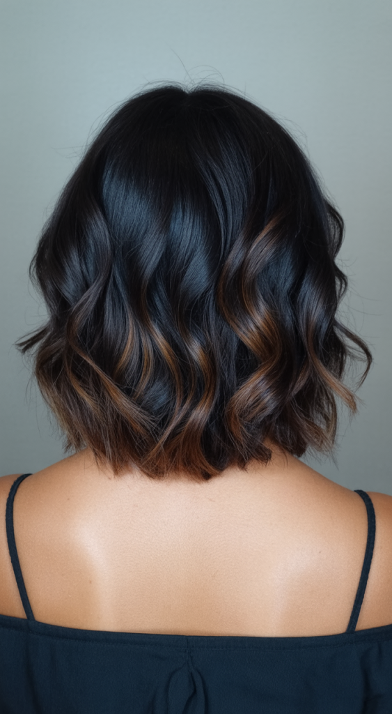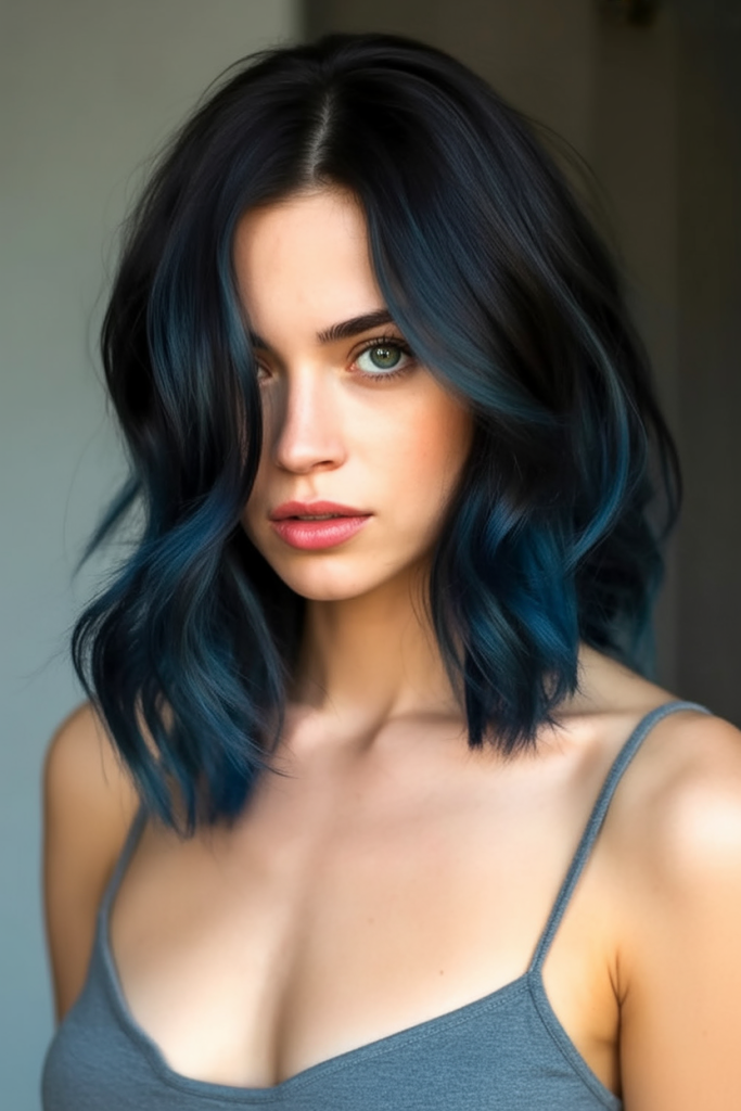 This stunning shoulder-length cut comes in an incredible midnight blue hue that seamlessly transitions into deep, rootsy tones. It’s an amazing choice for black hair lovers who want a bold pick-me-up without going overboard. The cool undertones and multidimensional shine make it especially flattering on cool complexions and for short hair with a strong personality. It’s moody, cool and refreshingly unique – ideal for a bold seasonal change or an unmistakable year-round statement.
