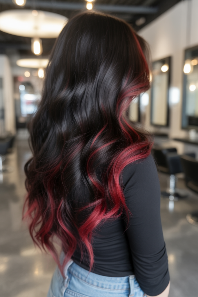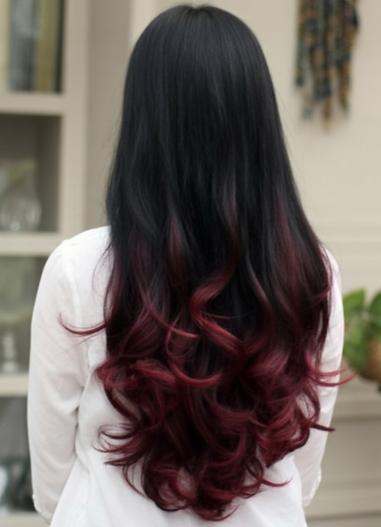 This stunning red melt on black hair is as bold as it is beautiful. The fiery colors create an amazing gradient that evokes strength and fun. It’s perfect for a person who is ready to try a fun and fearless update to their long hair. Whether you are at a concert or a fancy dinner, people will do a double take when they see this color.