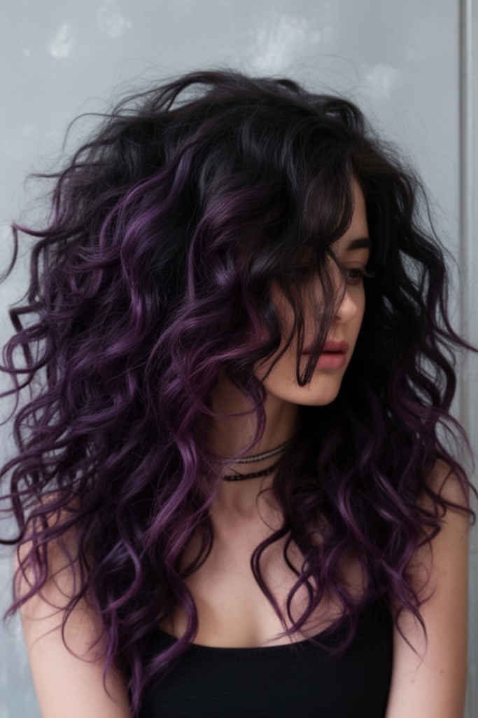 19. Voluminous curls with purple balayage
