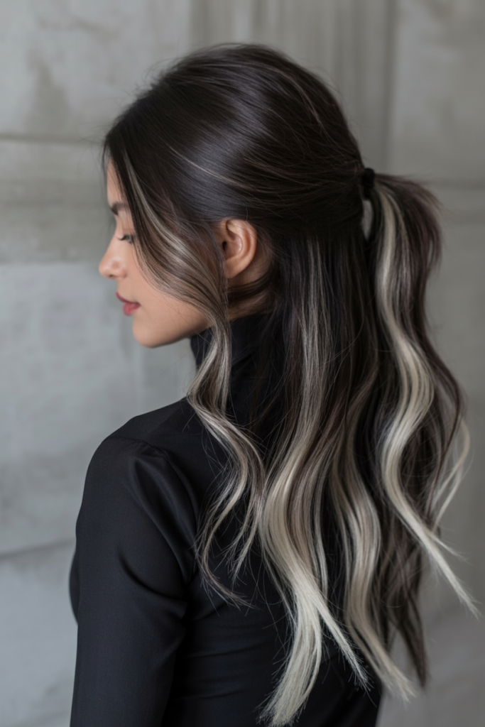 The sleek pony is characterized by bold streaks of ash blonde that stand in sharp contrast to theNevertheless, this gives way to a rich, dark brunette foundation, velvety experience of a hair color, it is not mentioned whether the color is permanent or temporary. The placement also adds light and contrast, especially around the face. It’s an elegant, editorial for black hair or for brunettes who want to look slightly edgy but polished. Ideal for winter or special occasions.