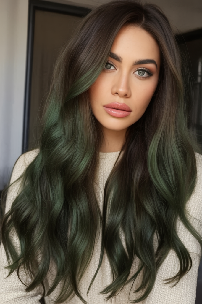 This is the definition of fun meets fearless. The understated foundation of the roots contrasts with the deep emerald ends for a dramatic pop of color. It’s a statement style that stays chic even as it becomes more of an attention grabber for those who don’t want to sacrifice their dark roots. Ideal for summer parties or simply as a way to add some edge to your everyday vibe, this look is absolutely unique.