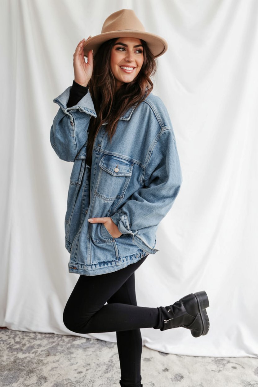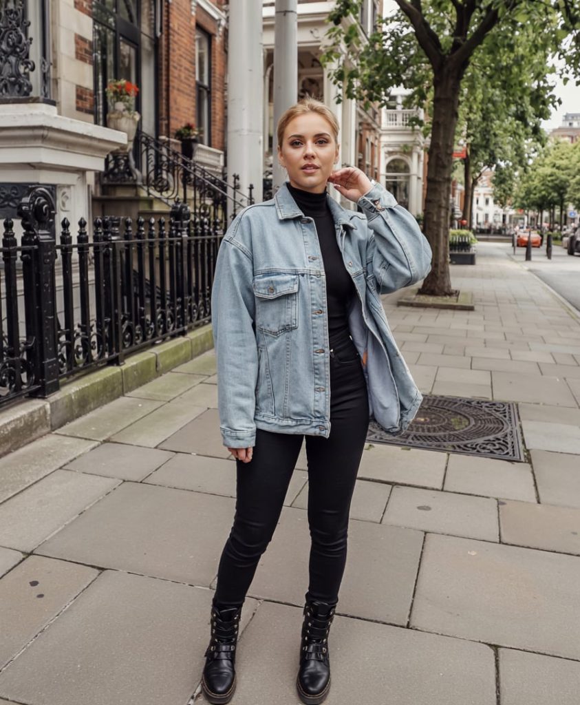 This look is the definition of “I just threw this on” confidence. The oversized denim jacket softens the all-black base, so you still feel approachable while looking sharp and put-together. It’s the kind of outfit you wear for a city walk, a coffee run, or meeting a friend after work, and it instantly reads modern, minimal, and a little bit cool. The clean lines keep the outfit from feeling too casual, and the lace-up boots add just enough edge to balance everything out.