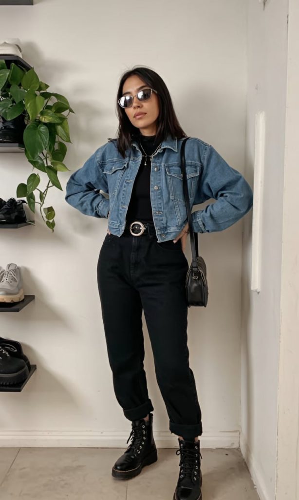This look is sleek, strong, and a little bit edgy. The cropped denim jacket highlights the waist and balances beautifully with high-rise black jeans and lace-up boots. A simple black top and structured belt make the outfit feel intentional, while the sunglasses and crossbody bag add quiet confidence. It’s a great example of how denim can feel grown-up and sharp, not just casual weekend wear.