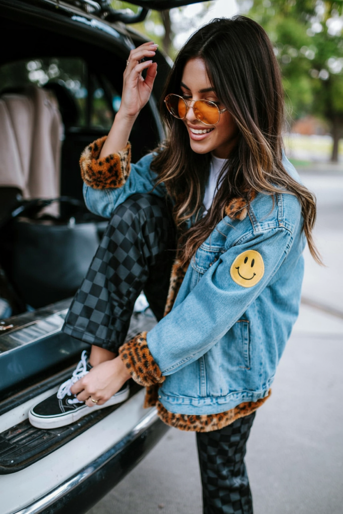 This outfit is pure joy—playful, quirky, and completely unforgettable. The denim jacket trimmed with faux-fur leopard and a bright smiley patch feels like an embellished piece you picked up from a cool upcycled boutique. Paired with checkered pants and classic sneakers, it turns a simple base into a standout aesthetic moment. The tinted sunglasses pull everything together, adding a warm glow that makes the whole look feel fun and carefree.