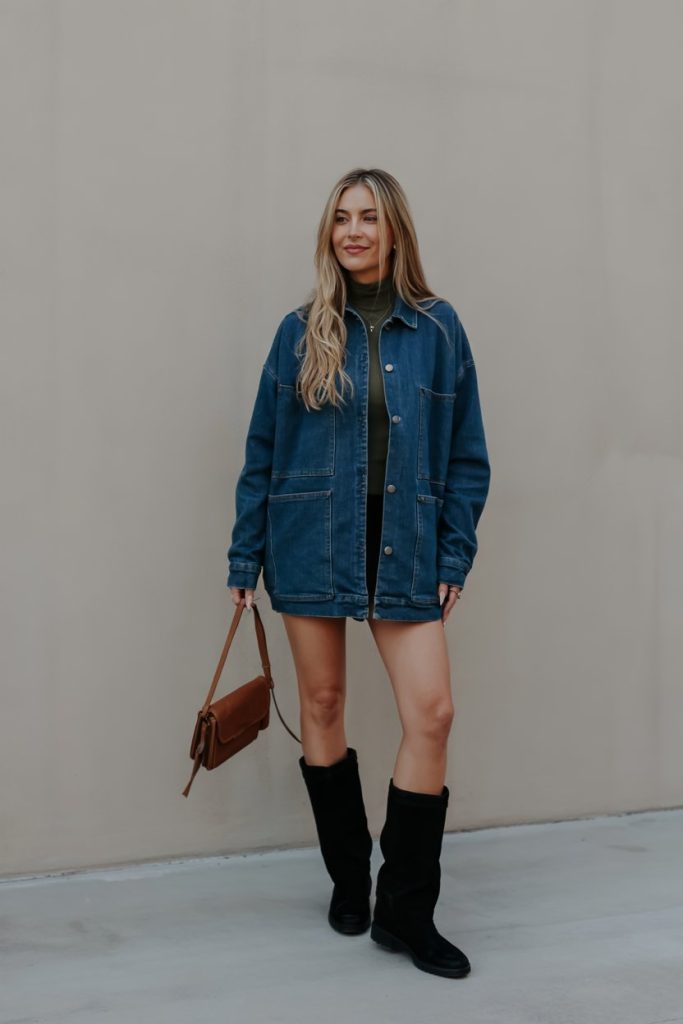 This look is such a quiet-confidence moment: just a simple olive mini, an oversized denim shacket, and tall black boots, yet it feels completely intentional. The longer jacket gives a relaxed, slightly borrowed-from-the-boys vibe, while the short hemline keeps things playful and feminine. The earthy tones of the dress and the tan shoulder bag create a soft fall aesthetic that feels modern but not try-hard—like the kind of outfit you throw on for a casual date, winery afternoon, or weekend brunch and end up getting compliments all day.