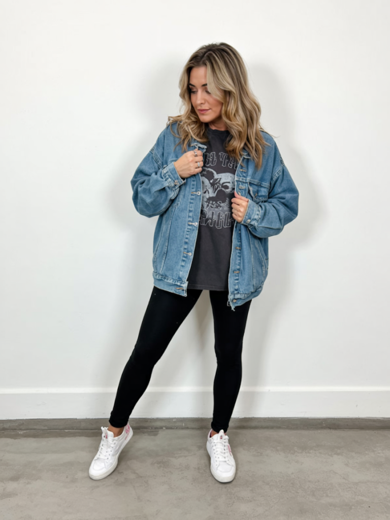 This is the cool, music-lover version of a basic jeans-and-jacket combo. The vintage-style graphic tee peeking out from under a relaxed denim jacket gives instant personality, while simple black leggings keep the silhouette sleek and comfortable. White sneakers pull everything together, creating an outfit that feels youthful without trying to look like you raided your teenager’s closet.