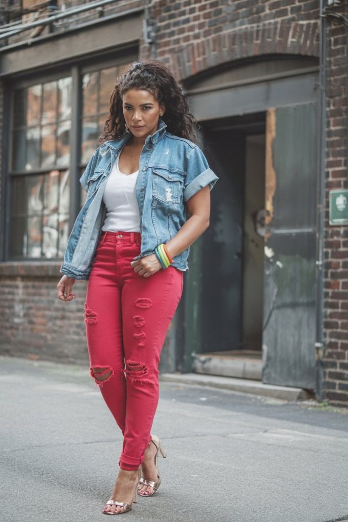 If you love making an entrance, this bold combo of a rolled-sleeve denim jacket and fiery red jeans is your moment. The slightly distressed jacket feels relaxed and effortless, while the bright pants bring all the drama in the best way. Paired with a fitted white top and heels, the whole outfit feels powerful but still playful, like something you’d wear for drinks on a Friday night or a daytime date when you want your outfit to do the talking.