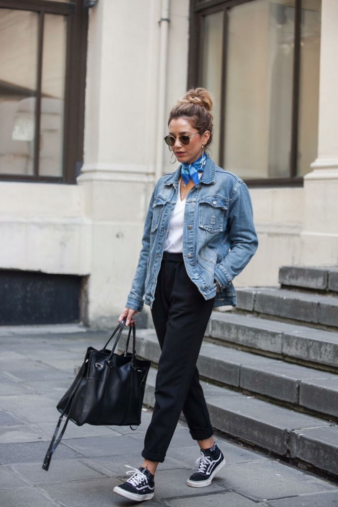 This look proves that a denim jacket can absolutely belong in your “grown-up” wardrobe. Paired with a crisp white top, tapered black trousers, and classic sneakers, it strikes that smart-casual balance we’re all chasing. The bright scarf at the neck adds a pop of color and polish, while the roomy tote keeps it practical for workdays or city errands. It’s relaxed, yes—but still very much a put-together outfit.