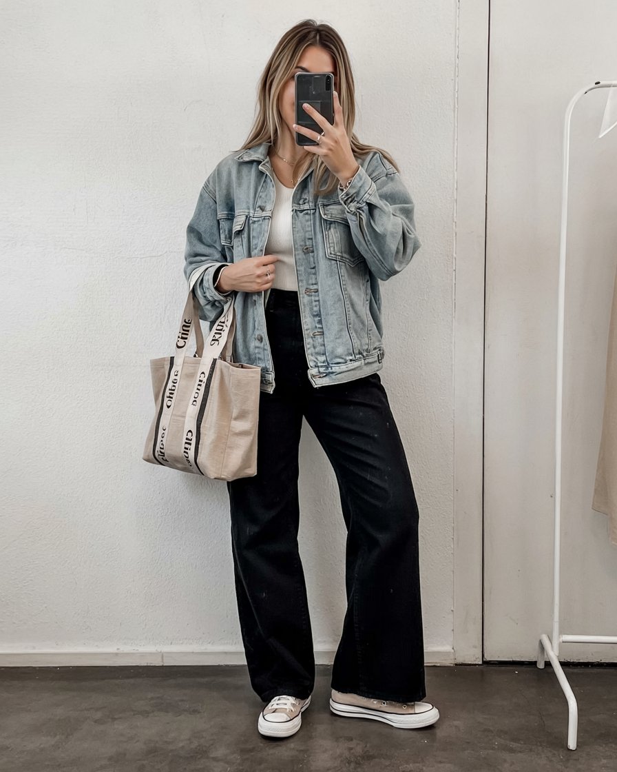 This outfit feels like the stylish version of “throw it on and go.” The relaxed denim jacket layered over a simple white tank and wide-leg black jeans gives you comfort with a little drama in the silhouette. Casual sneakers and a roomy tote make it perfect for errands, school pickup, or a weekend coffee run, while the slightly oversized proportions keep it feeling modern and fashion-forward.