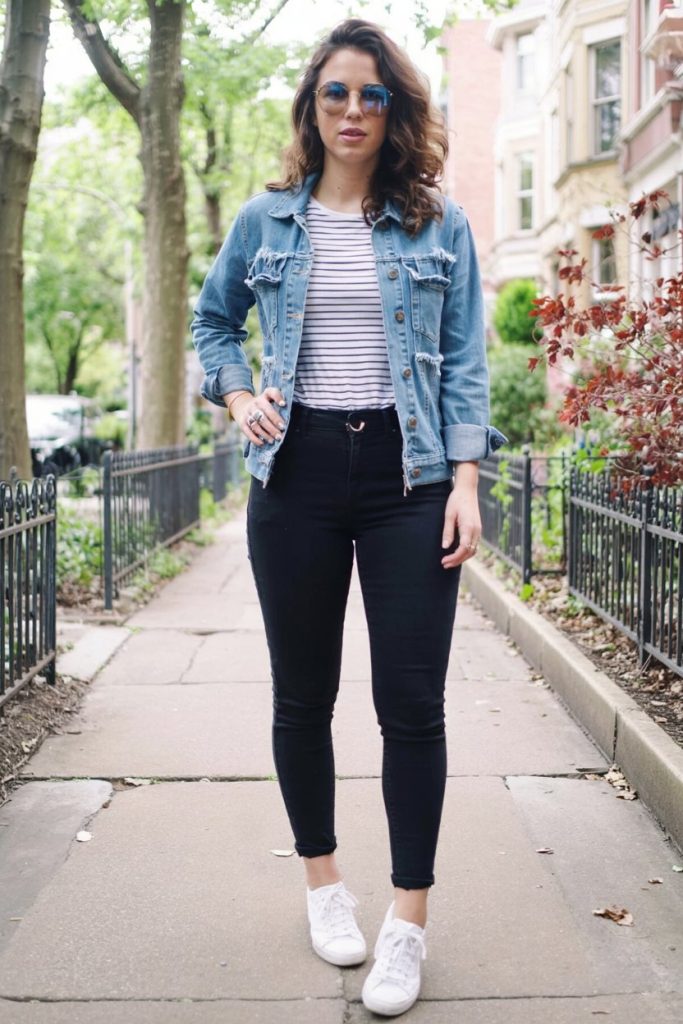 There’s something timeless about a striped tee under a slightly distressed denim jacket, especially with slim black jeans and fresh white sneakers. This outfit has that casual Paris-meets-Brooklyn energy: easy, unfussy, but quietly polished. The blue sunglasses add a fun twist without overpowering the look, giving it a modern city aesthetic that works for brunch, school runs, or just wandering your favorite neighborhood.
