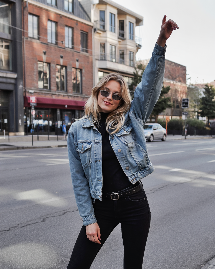 There’s such a fun attitude in this outfit: a fitted black turtleneck, high-rise skinny jeans, and a cropped denim jacket that hits just at the waist. The raised arm and relaxed pose match the energy of the look—confident, a little rebellious, but still totally wearable for everyday life. It’s the sort of outfit that makes you feel ready for anything, whether that’s running errands or meeting friends downtown.