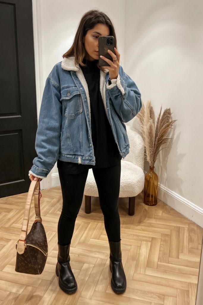 This look feels like a warm hug that happens to be incredibly chic. The sherpa-lined denim jacket instantly reads cozy, especially layered over an all-black base and chunky boots. It’s the kind of outfit you reach for on chilly mornings when you still want to look intentional, not bundled. The textures give it dimension, and the structured bag keeps everything feeling elevated instead of overly casual.