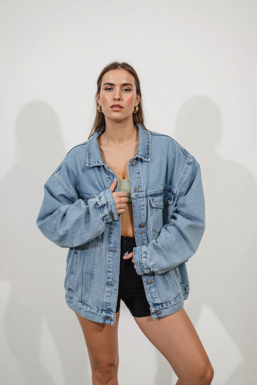 This outfit blends sporty energy with relaxed street style. An oversized denim jacket drapes effortlessly over a cropped sports top and black bike shorts, creating a look that feels gym-adjacent without looking like you just left a workout. The rolled sleeves, soft fabric, and simple jewelry give it an easy-going attitude, perfect for grabbing smoothies, walking the dog, or meeting a friend for an afternoon stroll.