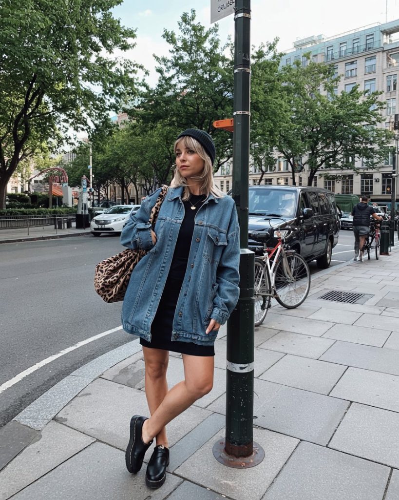 Here’s the easiest way to make a simple dress outfit feel street-style ready. An oversized denim jacket thrown over a fitted black dress instantly tones it down just enough for daytime, while loafers keep everything walkable and chic. The beanie and animal-print tote add a playful twist, so the outfit feels relaxed but still thoughtfully styled—a perfect mix for grabbing lunch, sightseeing, or commuting through the city.