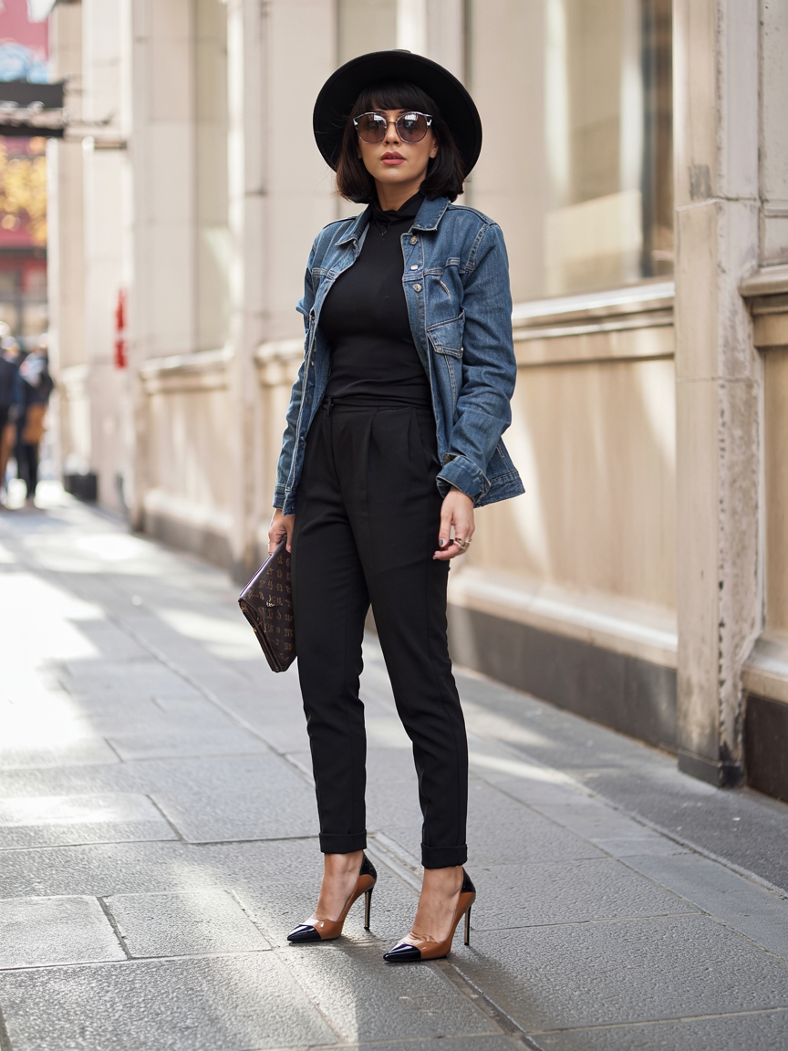 This look is pure city confidence: an all-black base styled with a fitted denim jacket, sleek trousers, and pointed heels. The wide-brim hat and sunglasses frame the face and add drama, turning simple pieces into a striking outfit that could go from office hours to date night. It feels polished but not fussy, like a modern twist on classic tailoring with just enough edge to keep it interesting.